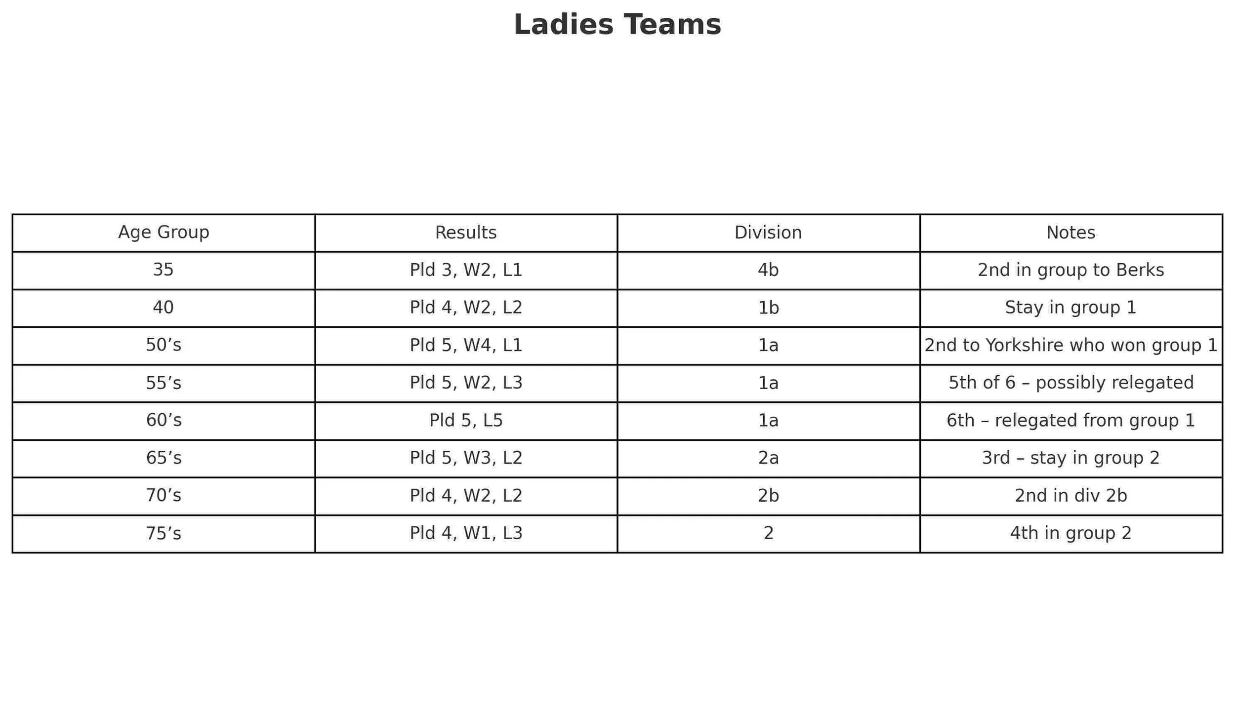 Our 14 Women’s & Men’s Seniors County Teams compete across the country from April to October in the LTA Seniors County Cup. All 14 teams competed in either division’s 1 or 2 in 2025 with results as follows:
